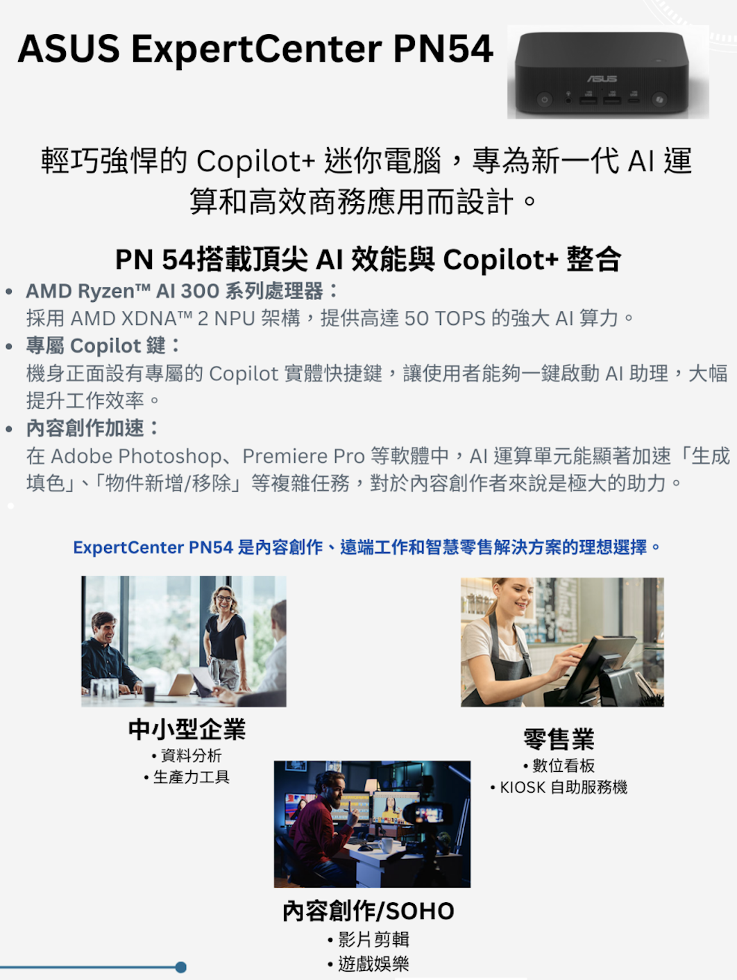 輕巧強悍的 Copilot+ PC,搭載 AMD Ryzen™ AI 7 350 處理器,提供閃電般的疾速效能與全方位的無縫連線體驗。配備 6 組 USB 連接埠、支援四個 4K 螢幕輸出,並搭載 Wi-Fi 7 技術,完美滿足您的日常運算所需。